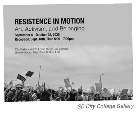 SDVAN Monthly Message for Jan 2025 Art imagines, science answers: and the answer is final. C.P. Snow Our banner this month is in support of Art Workshops across the county including these at (left to right) The Athenaeum Music and Art Library , Oceanside Museum of Art , The Front Porch Art Gallery, ArtReach and Pacific View Arts Center. But there many other programs including the Reflection sculpture workshop at MCASD La Jolla, Prebys Education Center from Jan 10 to Feb 28 from 10 am to 12:30 for those 55 and over with no art experience needed. There are one day Photography workshops in Balboa Park with the Institute of Contemporary Art and their Ceramic workshops for all levels in Cardiff by the Sea. Check out our calendar of events to see an enormous list of workshops. We are pleased to announce that on Firday, Jan 24 from 5 to 7 pm, SDVAN will c-host Conversations: San Diego Arts Prize 2024 featuring Gabriel Boils, Francisco Eme, and Marisol Rendón and the curator Lara Bullock. It is also the launch of our 2024 Catalog, available for FREE to all who attend. In our 17th year, we are so proud to have the exhibition for these artists of excellence in Balboa Park for the first time at the San Diego History Center until March 30th, 2025. The San Diego Visual Arts Network and Mission Fed ArtWalk are pleased to offer The Business of Art Scholarshipfor the 2025 Mission Fed ArtWalk in Little Italy on April 26 and 27, 2025. The scholarship will be awarded to one emerging visual artist who has a body of work to be shown and sold at the event. To apply there is a two-page application to submit along with five photographs of your artwork to sean@artwalksandiego.org by 5 pm on Jan 24, 2025. Applications will be reviewed by the Business of Art Scholarship partners and one scholarship recipient will be announced in early 2025. City Lights at Quartyard (1301 Market Street San Diego, CA 92101) has a new immersive art pop-up in East Village. The SDVAN community is invited to have complimentary tickets to come and experience the event from now until January 19. It features audio-visual installations by 8 artists from San Diego led and designed by visual-digital artist Ben Guerrette. There are six unique zones – featuring lasers, reactive video, LED sculpture, projection mapping, and more – each inspired by a different aspect of city life. There is food and drink for purchase. Use this code ‘ART’ for free entry . LOCAL ART REPORTS BY LOCAL WRITERS A+ Art Blog by Patricia Frischer: How the Arts in California could be affected by the recent election Read the entire RAW column for December 2024 OPPORTUNITIES (click to see a list of all current opportunities listed on SDVAN) Hello Fashionistas! Front Porch Gallery is doing a second Creative Couture fashion show. They are looking for individuals who are interested in showcasing their work, whether it's fashion designs, any wearable art, or even a fabulous piece of clothing that has been in the closet waiting for its moment to shine! The show is Feb 15 from 3-5. But the deadline to submit up to 3 images of your artwork is Feb 1. More info Judy 925.330.6648 Front Porch Gallery also has a call for artists for Surfing Madonna Save the Ocean 5 with a March 2 deadline for a show from March 26 to May 28 th. Jurors: Cathy Carey, Front Porch Gallery Director of Programming and Mike Redman, President of Surfing Madonna Oceans Project. Land + Lenses is a placemaking program designed to activate Otay Valley Regional Park. They are offering paid apprenticeships (a $1,685 stipend) for ages 14–24 in this 100-hour program (approx. 5 hours/week) after school hours (January–July, specific dates TBD). More info: jeff@outsidethelens.org By Land and by Sea is the next Brooks Theater Gallery exhibition in Oceanside. Submission deadline is Dec 27 at 9 pm for a show running Jan 10 to Feb 4. There is an entry fee of $15 but those accepted get a free ticket to the performance. To participate contact Carol Naegele Art Scene West in downtown SD is making a call for artists for its Exhibition of Realism, beginning Feb 1st - March 30th. The deadline is Jan 17. Mental Wellness for Artists (Art Unites, Cycad Gallery) is seeking submissions from visual artists working in all mediums for inclusion in their art projects, exhibitions, and referrals scheduled from January to December 2025. The deadline is Dec 31 but submissions will be reviewed on a rolling basis. Artists whose work aligns with specific projects will be contacted directly. For more info: mentalwellnessforartists@gmail.com with the subject line: "2025 Artist Submission" Casa Familiar’s 18th Annual Dia de la Mujer Exhibition , this year curated by Claudia Cano is now open and calling for artists. The theme is Visions of the Future. Apply by Feb 2 . Remember: Heads up! the County supervisors have more money for the Community Enhancement grant, and there is an opportunity for individual artists to get grants that are being matched by the Prebys Foundation. You still have to go through a non-profit organization to apply. The new San Diego County Commission for Arts and Culture will be part of the decision panel. To apply for funding starting Dec 1, organizations can visit the County's Community Enhancement Grant portal. Check the designated box on your grant application to indicate interest. Application due Jan 31, 2025. Current grant applicants will be automatically reviewed for eligibility. For more info: 669 444 9171 arts@sdcounty.ca.gov . The fifth annual Teeny Tiny Art Mart at Oceanside Museum of Art starts in Feb 9 so start now to craft your own 5-inch by 5-inch miniature masterpiece. The deadline for Teeny Tiny Art submissions is Jan 12, 2025. Studio Ace reminds us that they are looking for new art teachers and teaching artists for 2025 to round out their offerings in Oceanside. Contact info@studioace.org Young Art 2025: Nurture and Nature at Museum of Photographic Arts at The San Diego Museum of Art. This is the