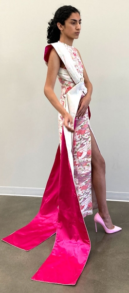 Nineteen teams, each composed of a Mesa College fashion student and a stitcher from Visions worked together to redesign and reconstruct kimonos, obis, haoris, and sashes to become a fashion garment. Each ensemble contains some element of embellishment created by the stitcher using hand or machine techniques. |